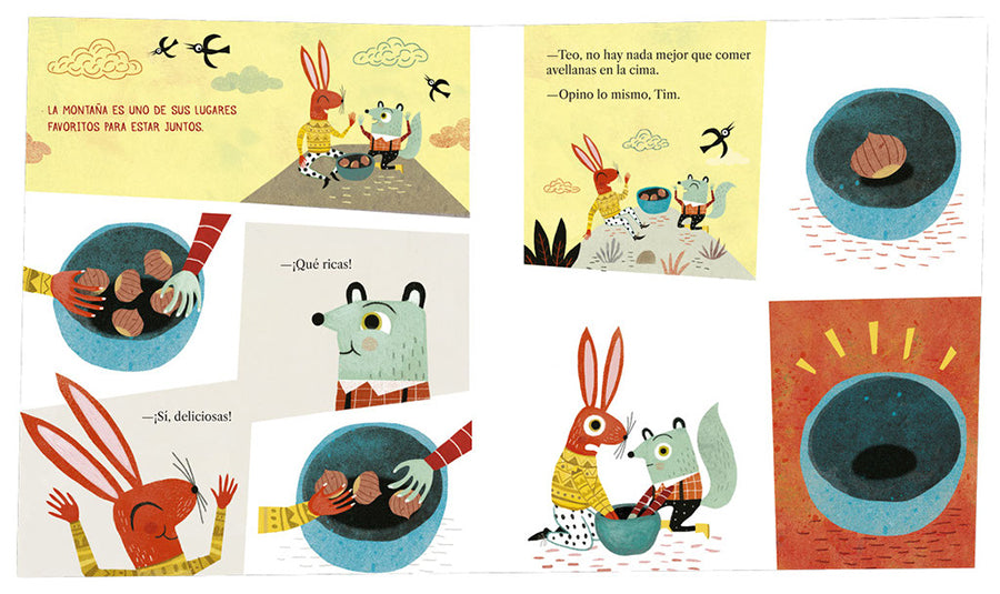 Tim y Teo son grandes amigos. Un día suben a la cima de la montaña para compartir unas avellanas. Pero cuando la última desaparece, la decepción y el enfado ponen en peligro su amistad.