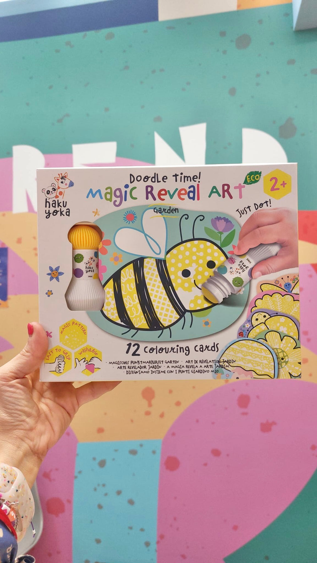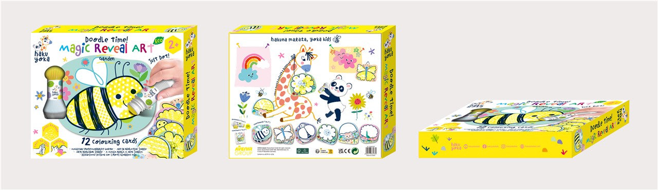 El set Arte de Puntos Mágicos - Haku Yoka es una propuesta creativa ideal para los más pequeños. Incluye 12 tarjetas ilustradas con diseños ocultos que solo se revelan al pintar con el marcador de puntos incluido. Cada tarjeta sorprende al mostrar formas, texturas y patrones mientras el niño pinta, haciendo de esta experiencia artística algo mágico y sensorial. Este juego no solo estimula la creatividad, sino que también refuerza la motricidad fina y la coordinación ojo-mano. Perfecto para introducir a niños y niñas a partir de 2 años en el mundo del arte de forma limpia, segura y emocionante. Además, el marcador es lavable, lo que facilita su uso repetido y seguro para el hogar.