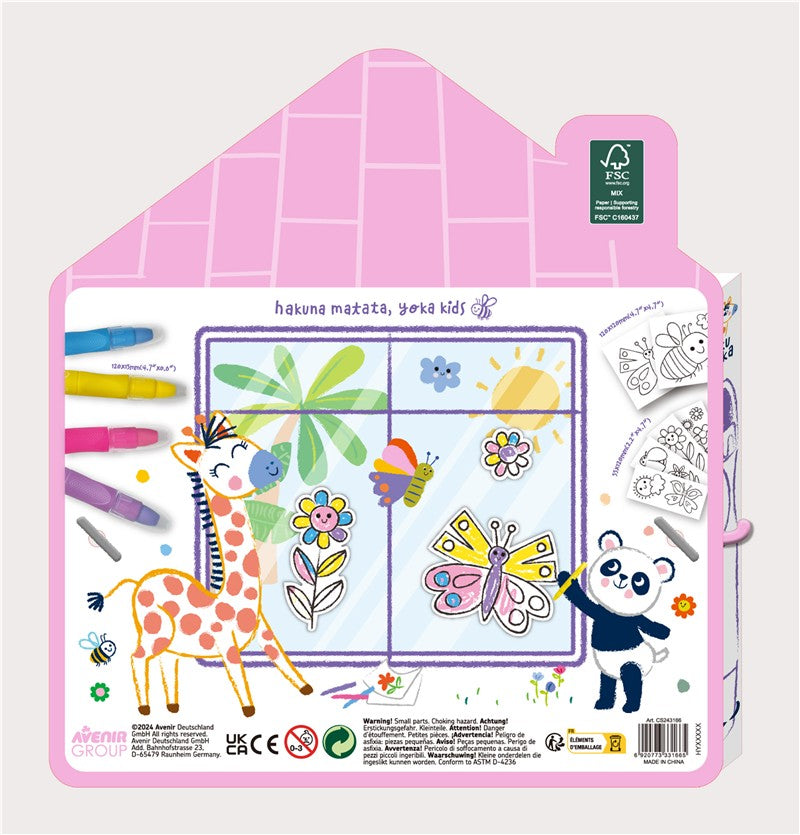 Set de arte reutilizable para decorar ventanas con pegatinas temáticas de animales y mariposas, incluye ceras lavables y fomenta la creatividad infantil sin ensuciar ni dañar superficies.