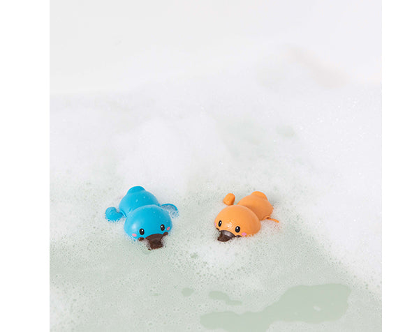 Dos adorables ornitorrincos listos para nadar en un solo juego y no requieren pilas, simplemente dales cuerda, suéltalos en la bañera y luego observa cómo los pequeños brazos del ornitorrinco giran mientras corren por el agua