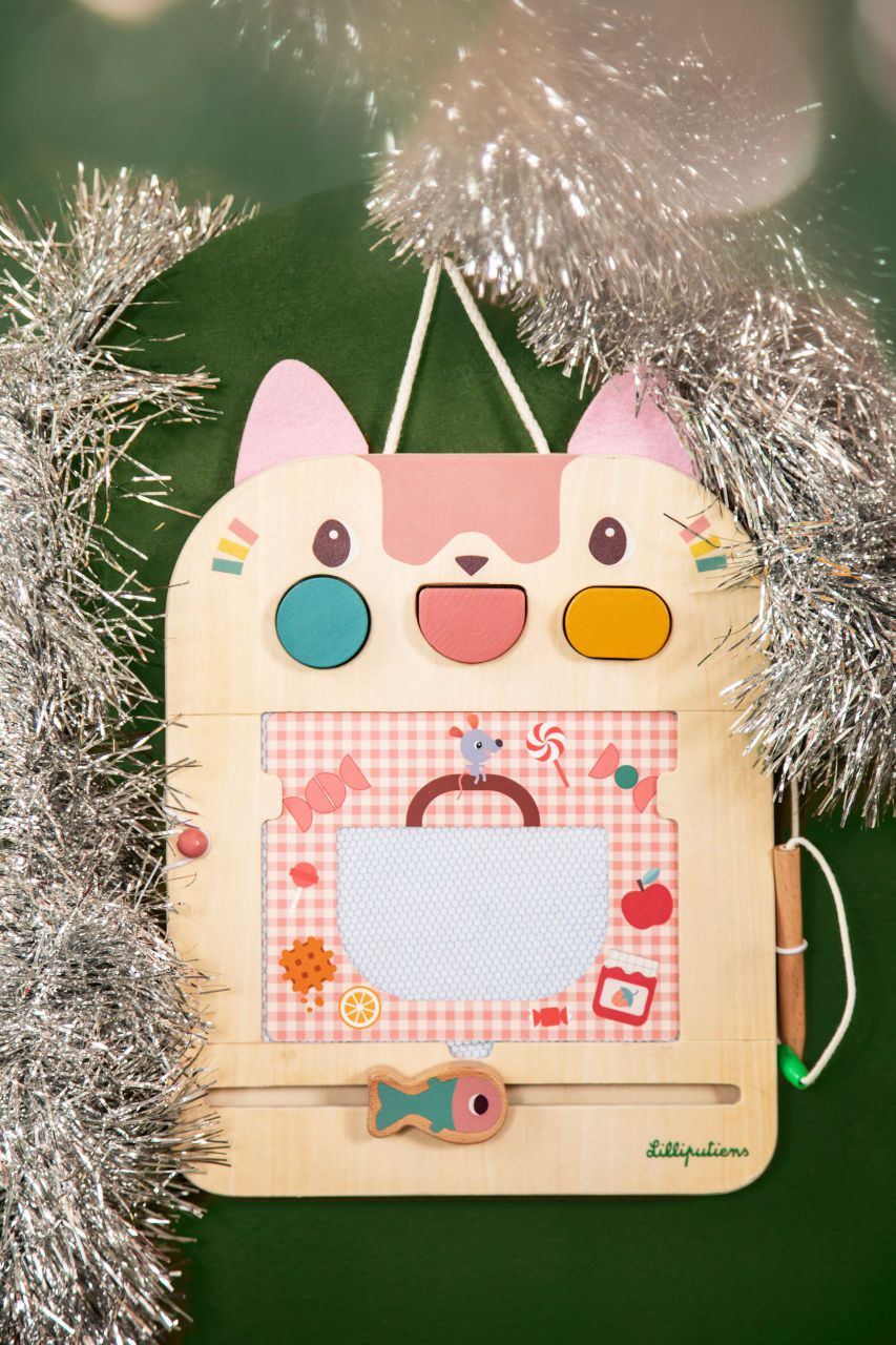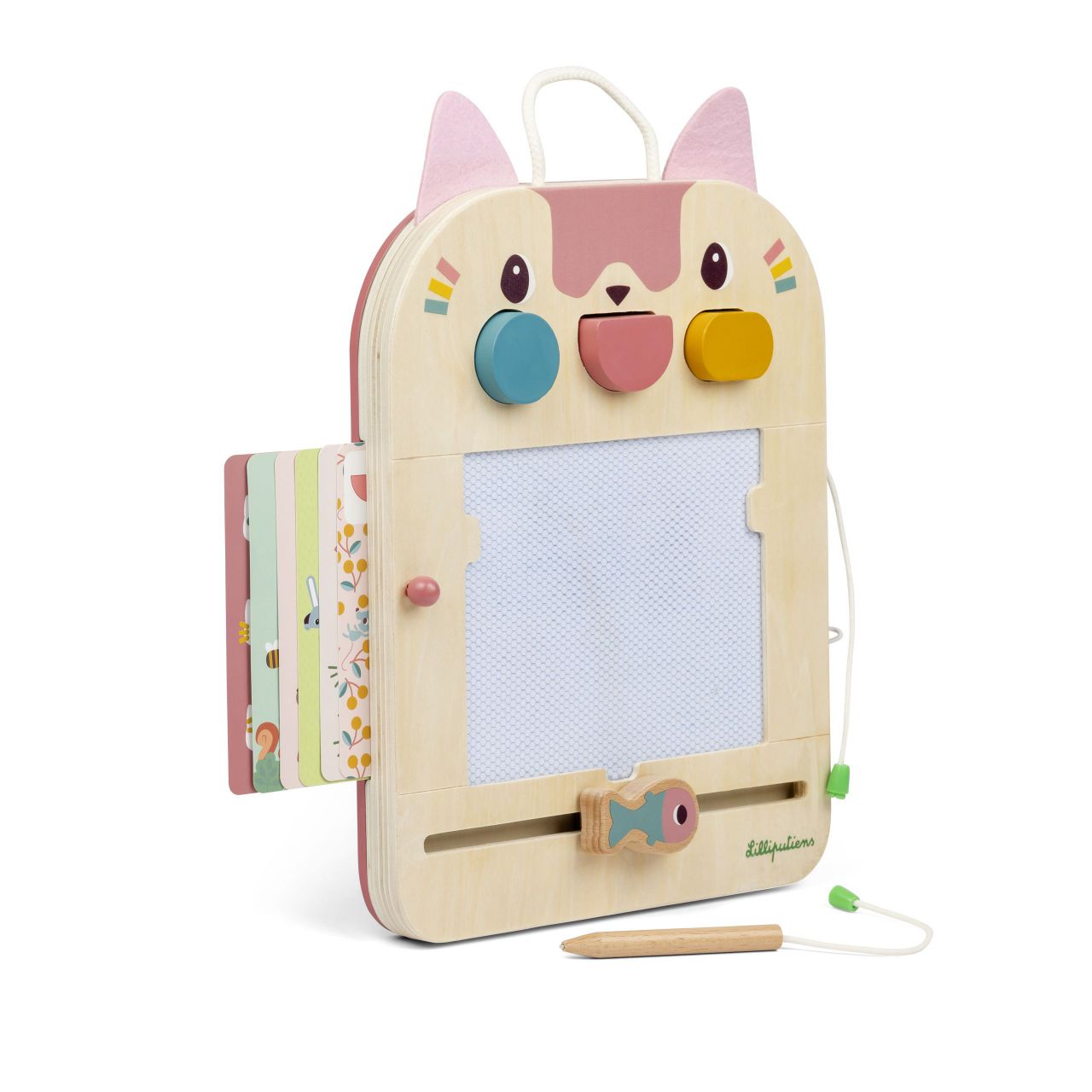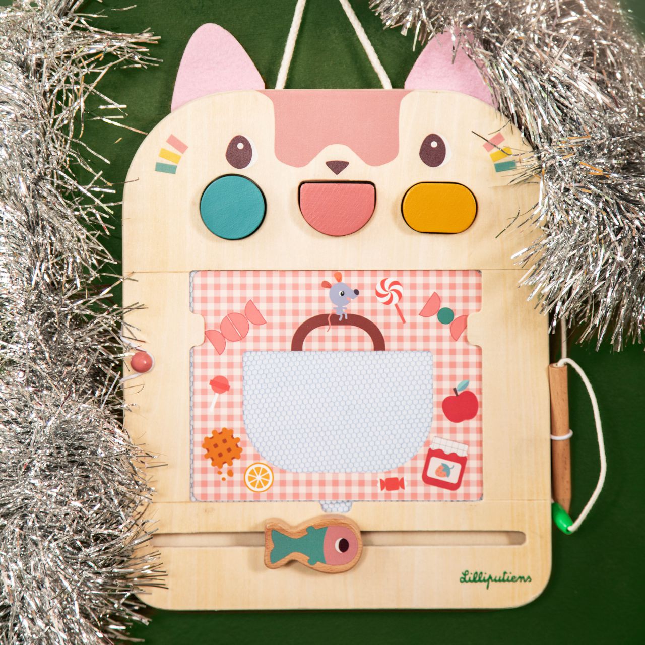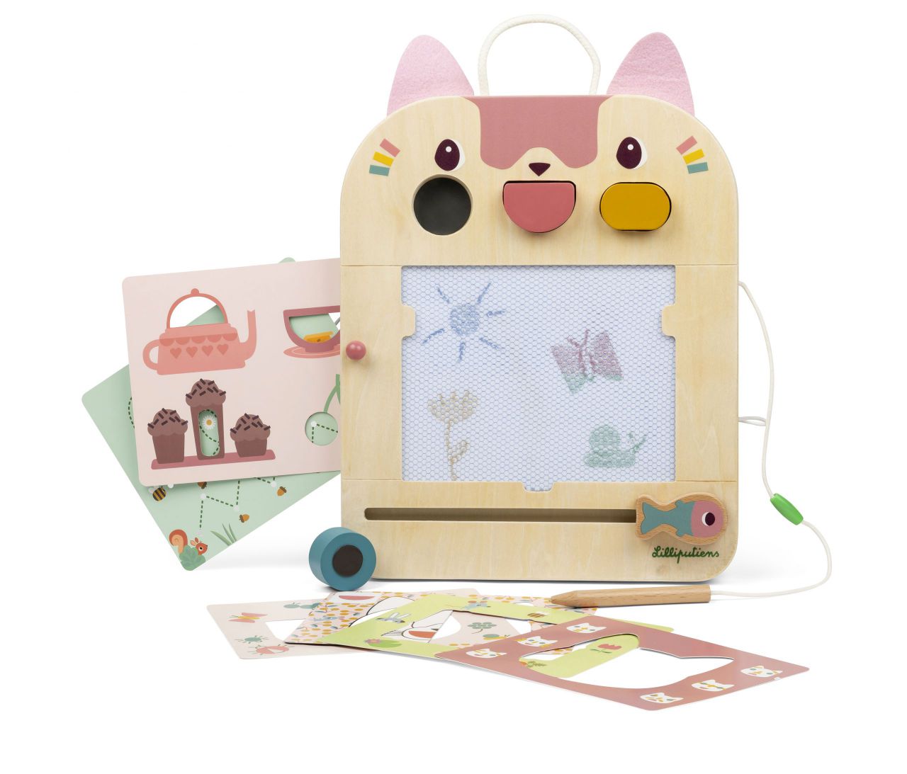 Una divertida pizarra mágica de Lilliputiens con 4 zonas de color, 3 formas magnéticas, un lápiz extraíble y 12 juegos, perfecta para horas de creatividad sin fin.