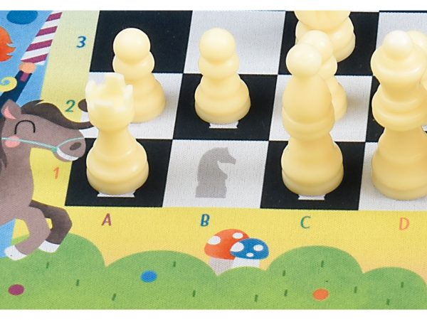 • Contenido:  1 tablero de neopreno (40x40 cm), 32 fichas de ajedrez de plástico, 1 guía de movimientos.